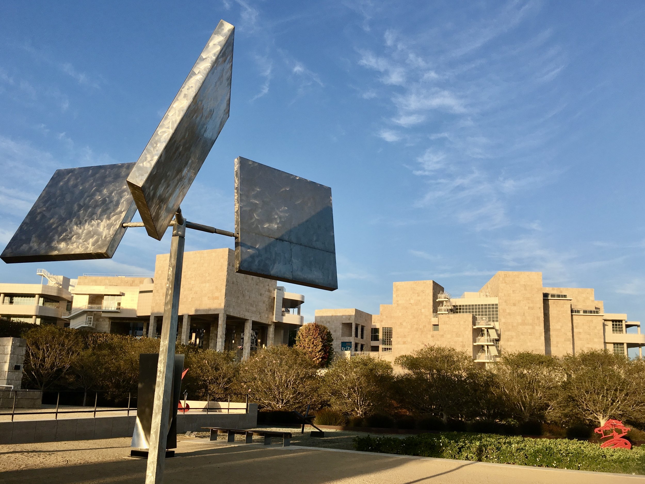 From the Getty Center website: Three large squares act as sails, catching the slightest breeze and setting this sculpture in motion. Spaced evenly apart from one another, the squares rotate around horizontal supports. These moving parts are attached to a central support about fourteen feet tall. Around this strong vertical axis, the squares move slowly--and randomly--in either direction. In 1965, Rickey began buffing the stainless steel planes of his sculptures to make them more responsive to motion and changes in ambient light. This technique made the movement of his work less predictable--encouraging the viewer to spend time observing his sculptures. Rickey's polishing process can be appreciated in the shimmering surface effects of this work.