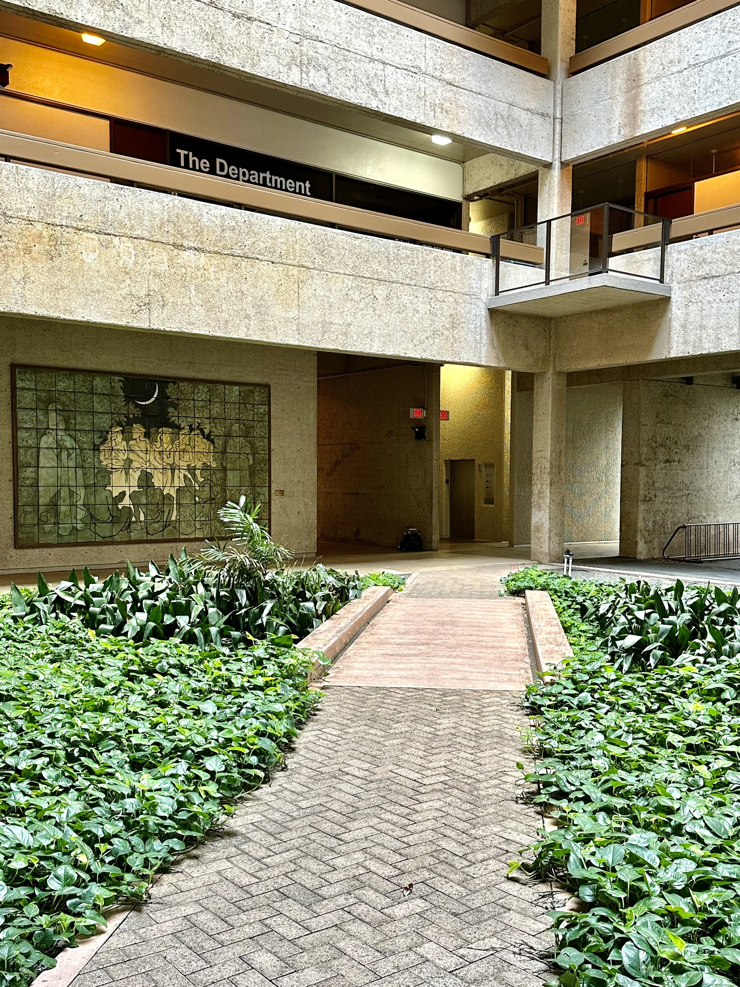 Bachman Hall, built in 1948, was the product of the partnership of Associated Architects, with Vladimir Ossipoff (1907-1998) serving as principal designer. In addition to Ossipoff, the collaboration consisted of architects Philip Fisk (d. 1958), Allen Johnson (1906-2000), Thomas Perkins (d. 1996), and Alfred Preis (1911-1993). Bachman Hall is distinguished by its unusual arrangement of spatial volumes, employing a pierced screen, “false” walls and windows, an open courtyard defined by square columns (and planted with contrastingly curving coconut palms), and a dramatic two-story entryway. The building has special significance for the architects’ collaboration with French-born muralist Jean Charlot (1898-1979), one-time student of the Mexican artist and revolutionary Diego Rivera (1886-1957).