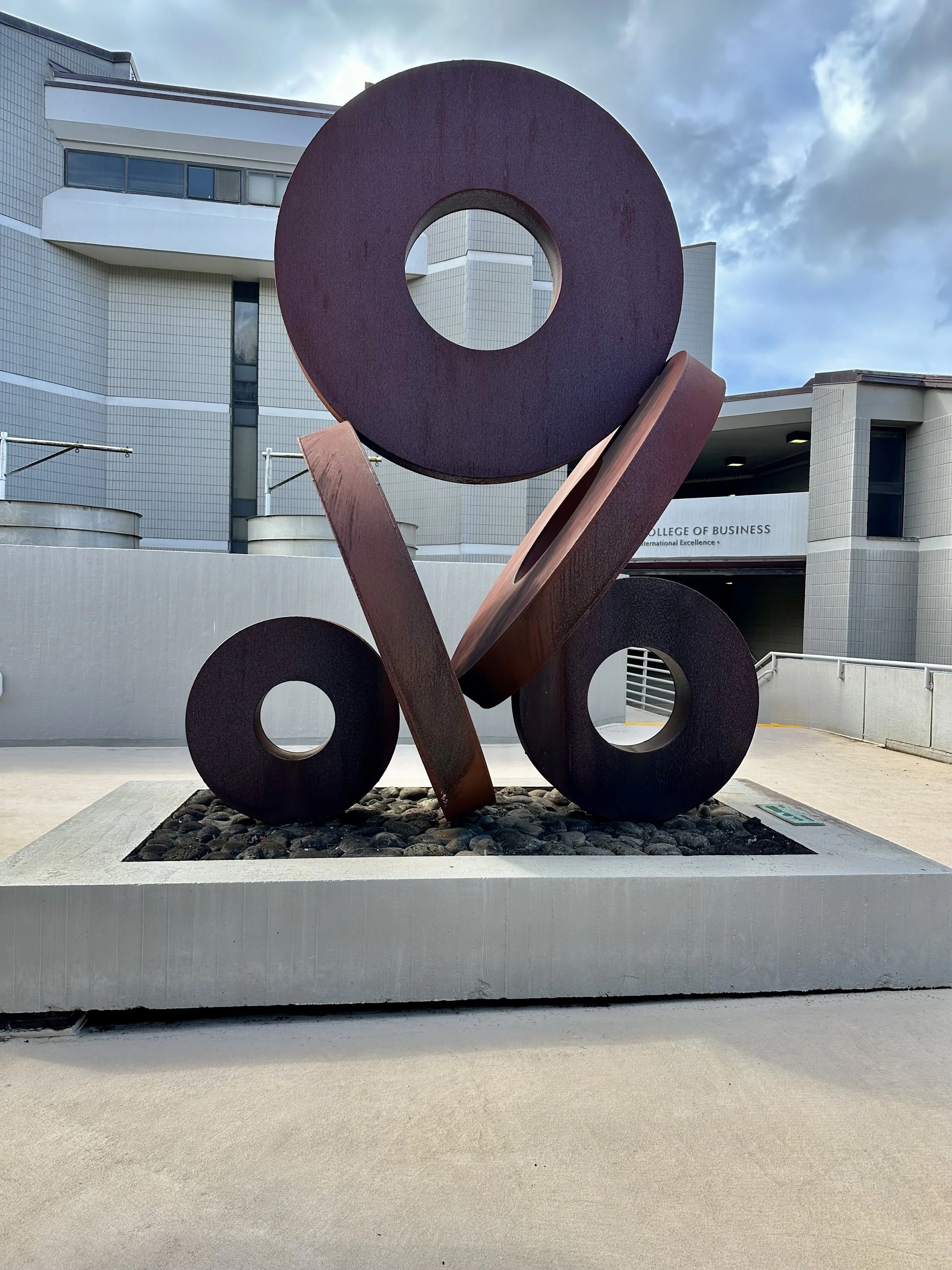 The sculpture “To the nth Power” (1971) by C.W. Watson is located on Maile Way outside of Shidler College of Business.