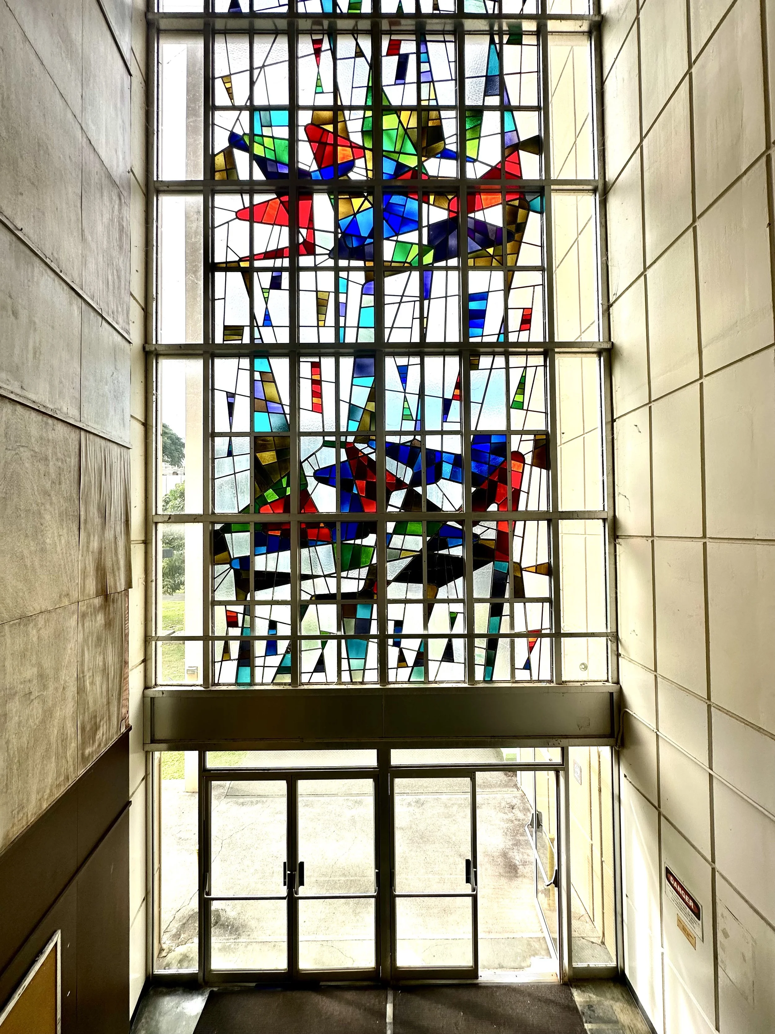 The 4-story Keller Hall designed by Clifford F. Young in 1959 is currently home to the Department of Mathematics. The building boasts some very unique stained glass windows by artist and one time University of Hawaii art professor Murray Turnbull.