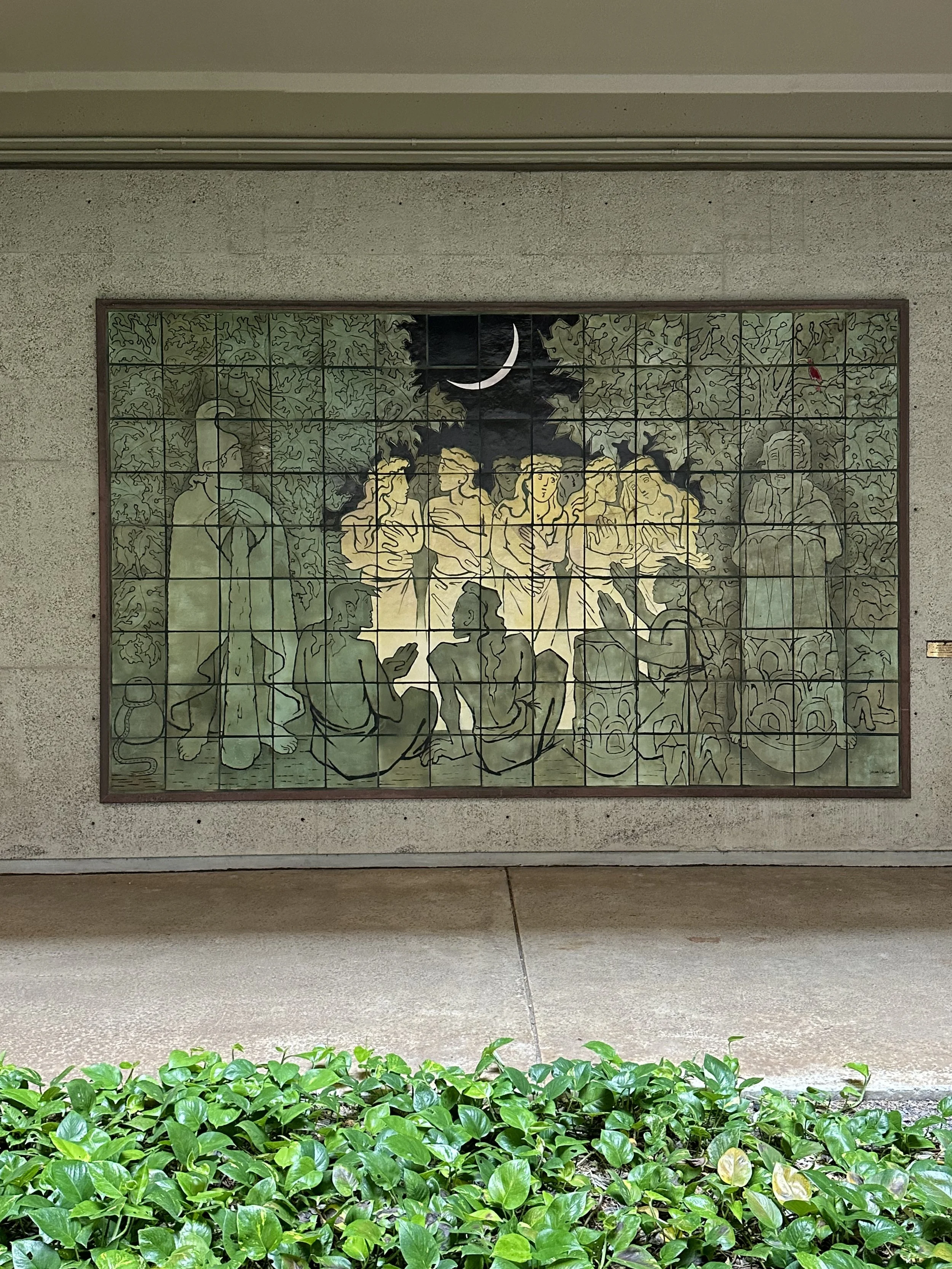 The ceramic tile mural Night Hula by Jean Charlot depicts Hawaiians celebrating with dance under a crescent moon. The mural was restored by Laura Ruby and Martha Ridgley in 2002.