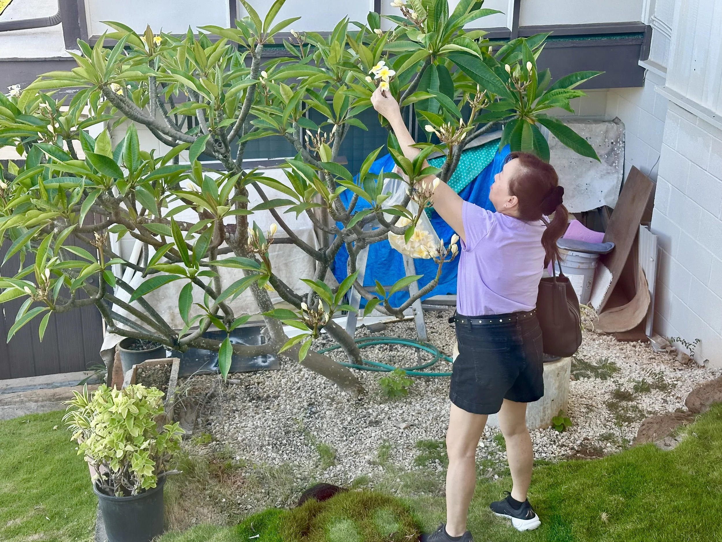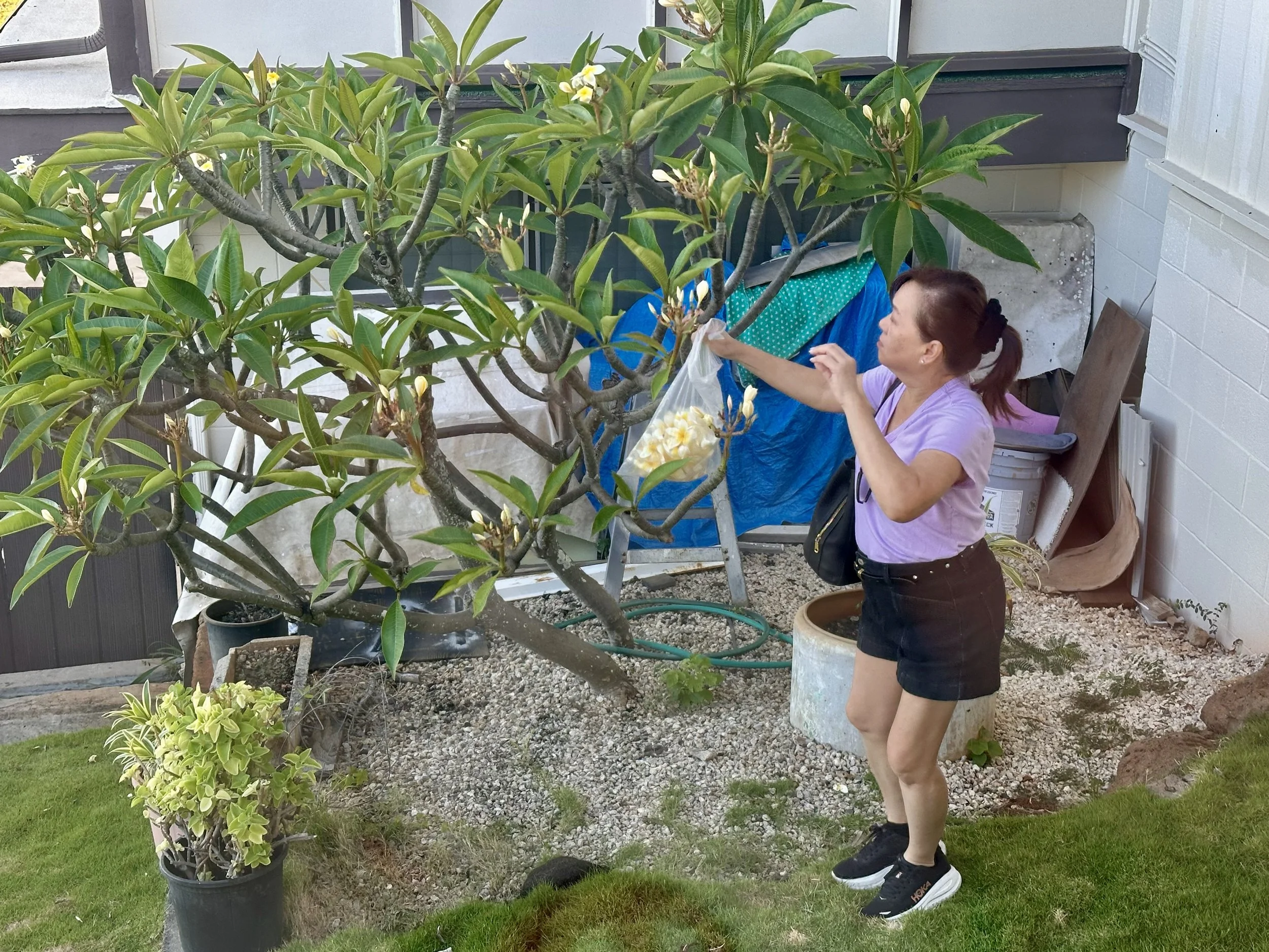 Sis recalls planting the tree about 35 years ago and that the type of plumeria tree we have is more fragrant than most. Also the action of picking from our tree feels meditative to her and she thought that I would find that to be the case for me as well!