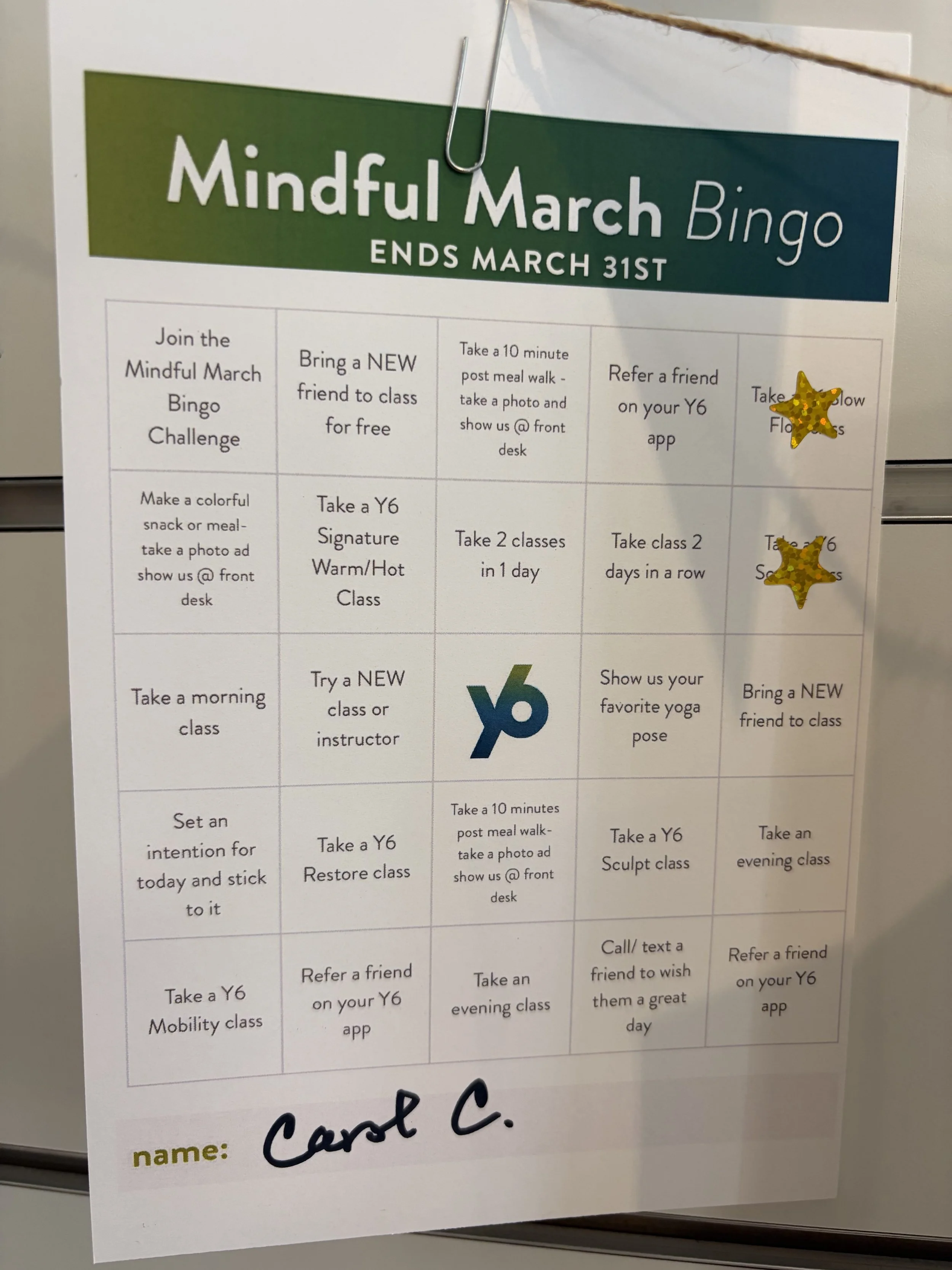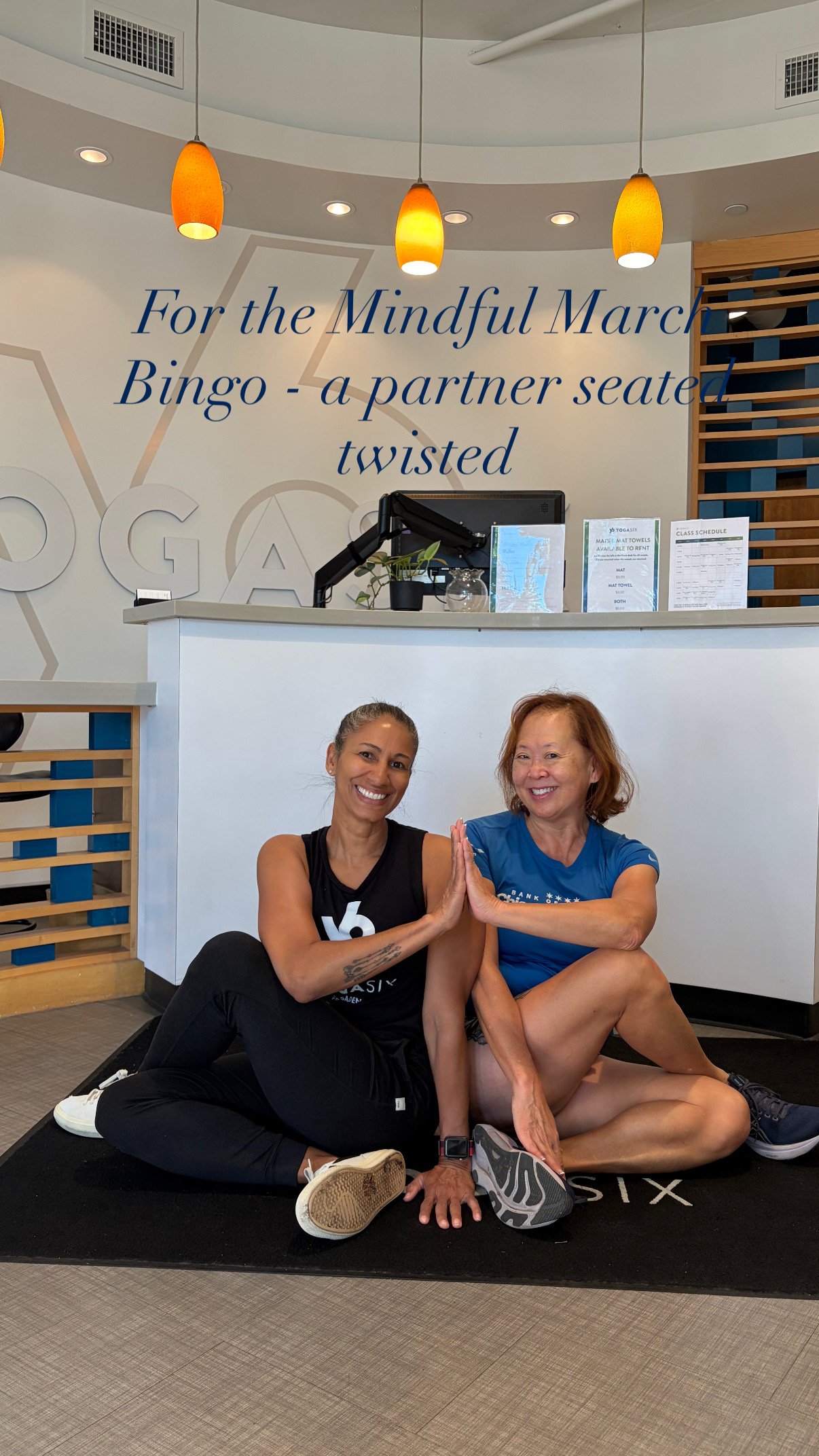 It’s that time of year again, another bingo challenge. I’m pleased with the seated partner pose above that my teacher Tiana and I created to satisfy one of the bingo card Mindful March squares.