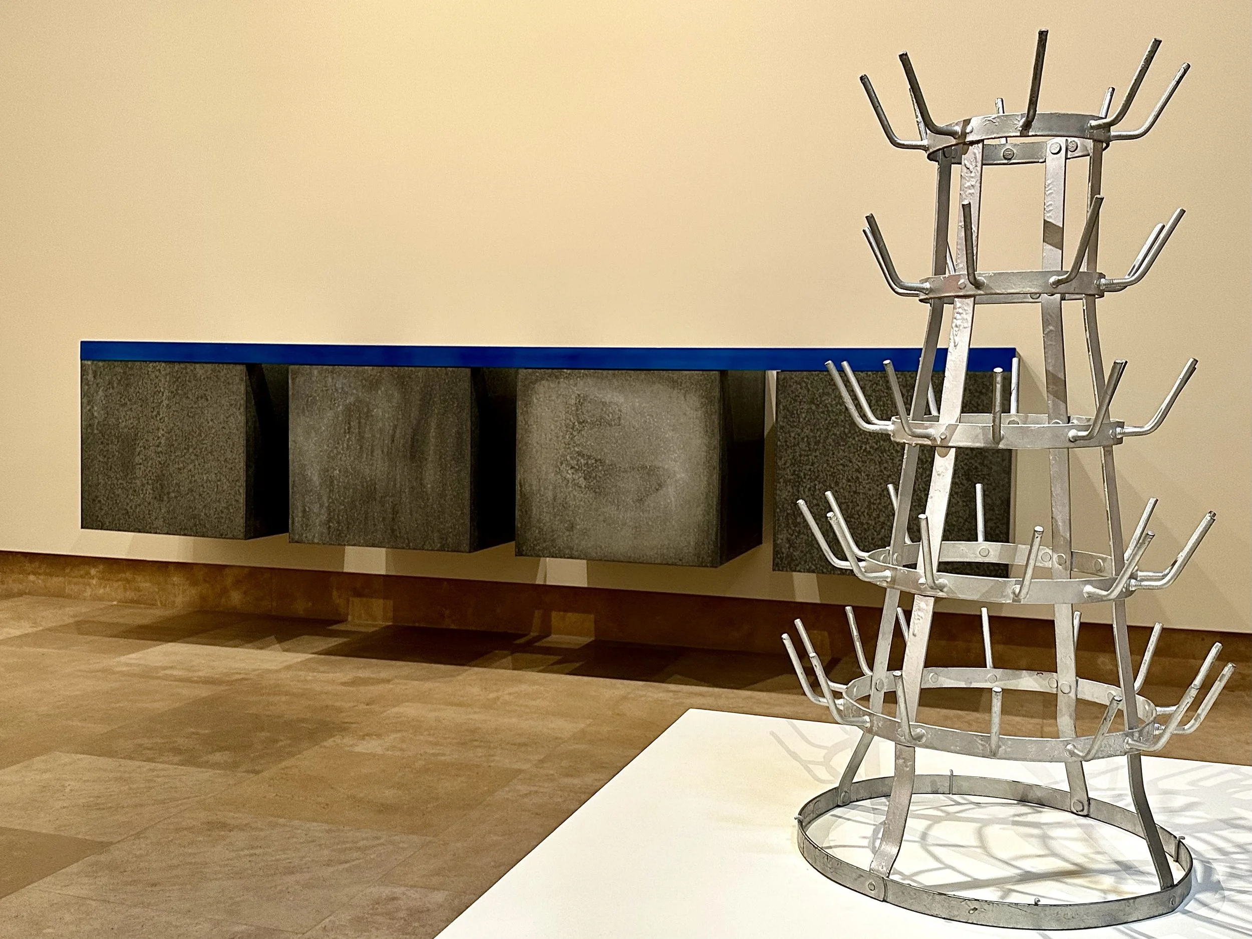 Below is a photo of Bottle Rack in relation to Judd’s boxes. For members lucky to drop by often, it’s nice when the museum brings artwork out from storage for a change in experience.