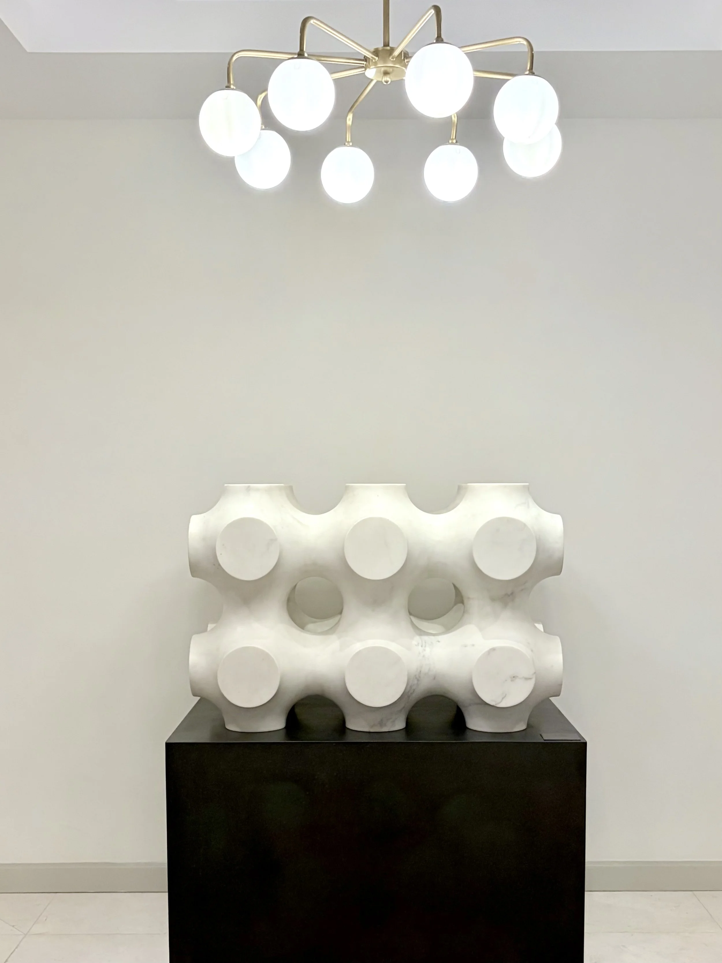 Named for the Nobel Prize-winning scientist Enrico Fermi, “Fermi” is one of only two known, white carrara marble sculptures that Tony Smith did during his career. The sculpture suggests the complex yet elegant structures found in nature.